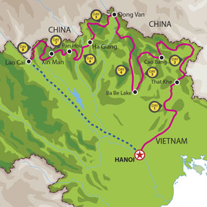 We leave Hanoi for Highway 34 on our way to Nghia Lo province and the lime stone plateau of Quang Nguyen. Along the way we can stop at famous battle fields in the Viet Minh’s war against the French in the 1950’s. We take time to explore back-roads and tracks along the border with China, stopping for a picnic lunch before heading to Pac Bo and Ho Chi Minh’s cave. Then head north through hill-tribe villages, forest and rivers to Bao Lac. The gate way to the Ha Giang plateau. Then climb through the rice terraces to Hoan Su Phi and down to the Dao hill-tribe village of Pan Hou, Bac Ha then Sapa. This 8 day ride has it all. Special jeep 4X4 adventures.